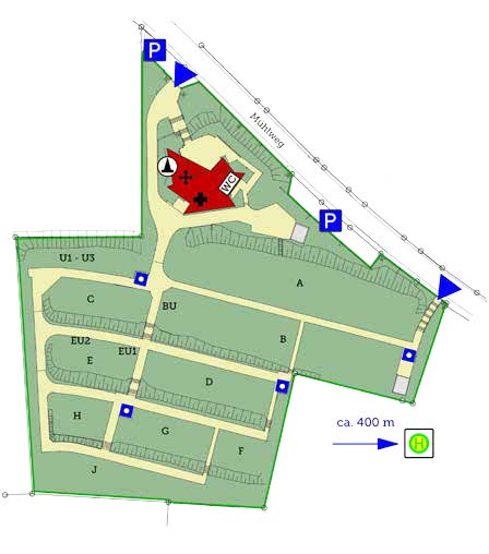 Der Plan dient der Orientierung auf dem Friedhof in Hofen bei der Suche nach vereinzelten Gräbern. Die einzelnen Abteilungen und ihre Bezeichnungen sind eingezeichnet.